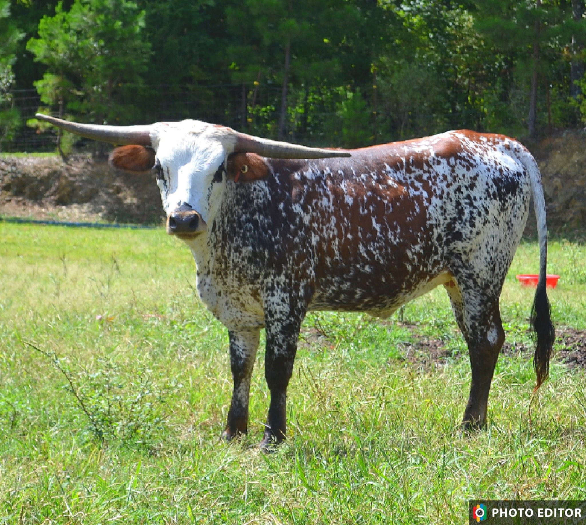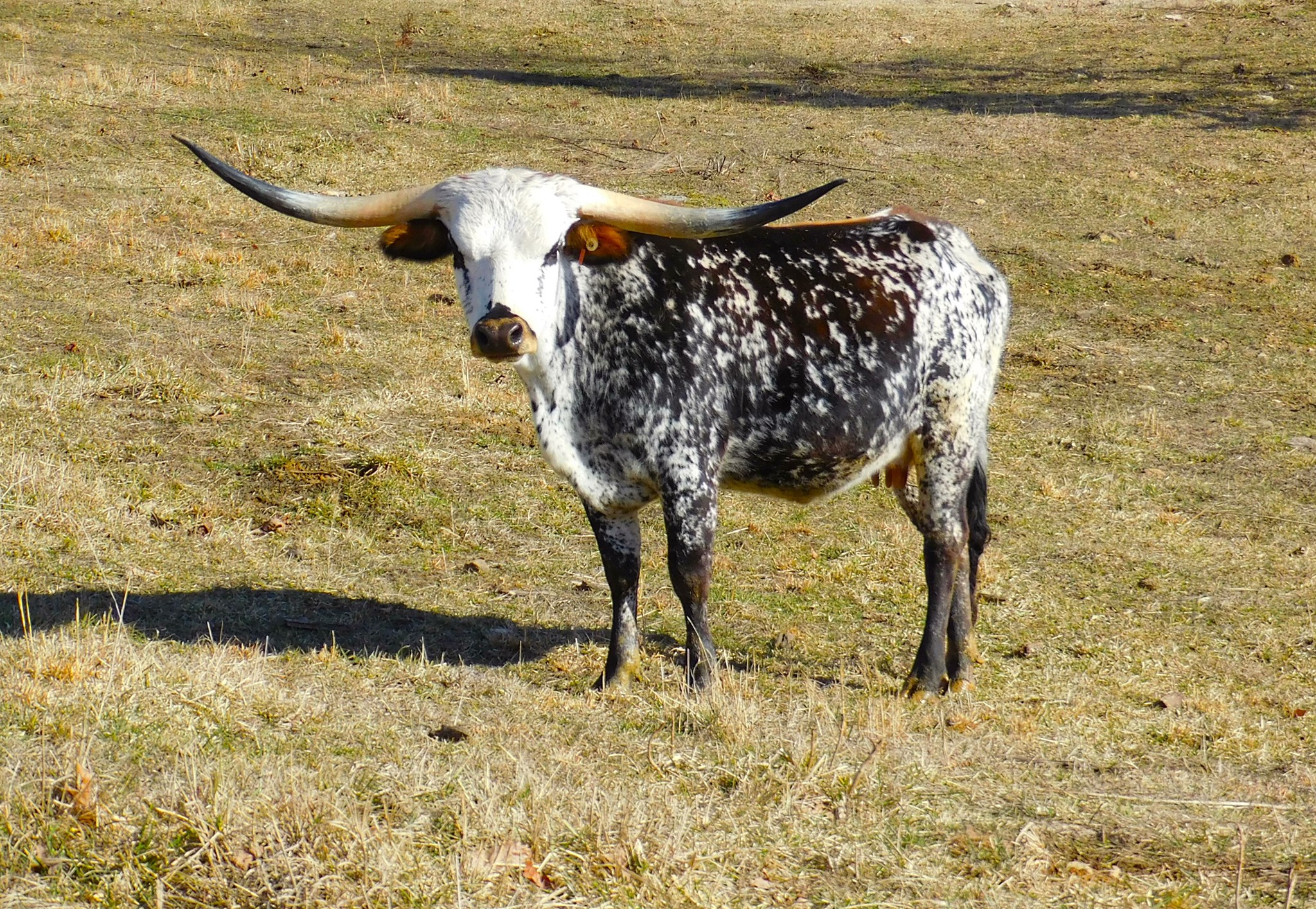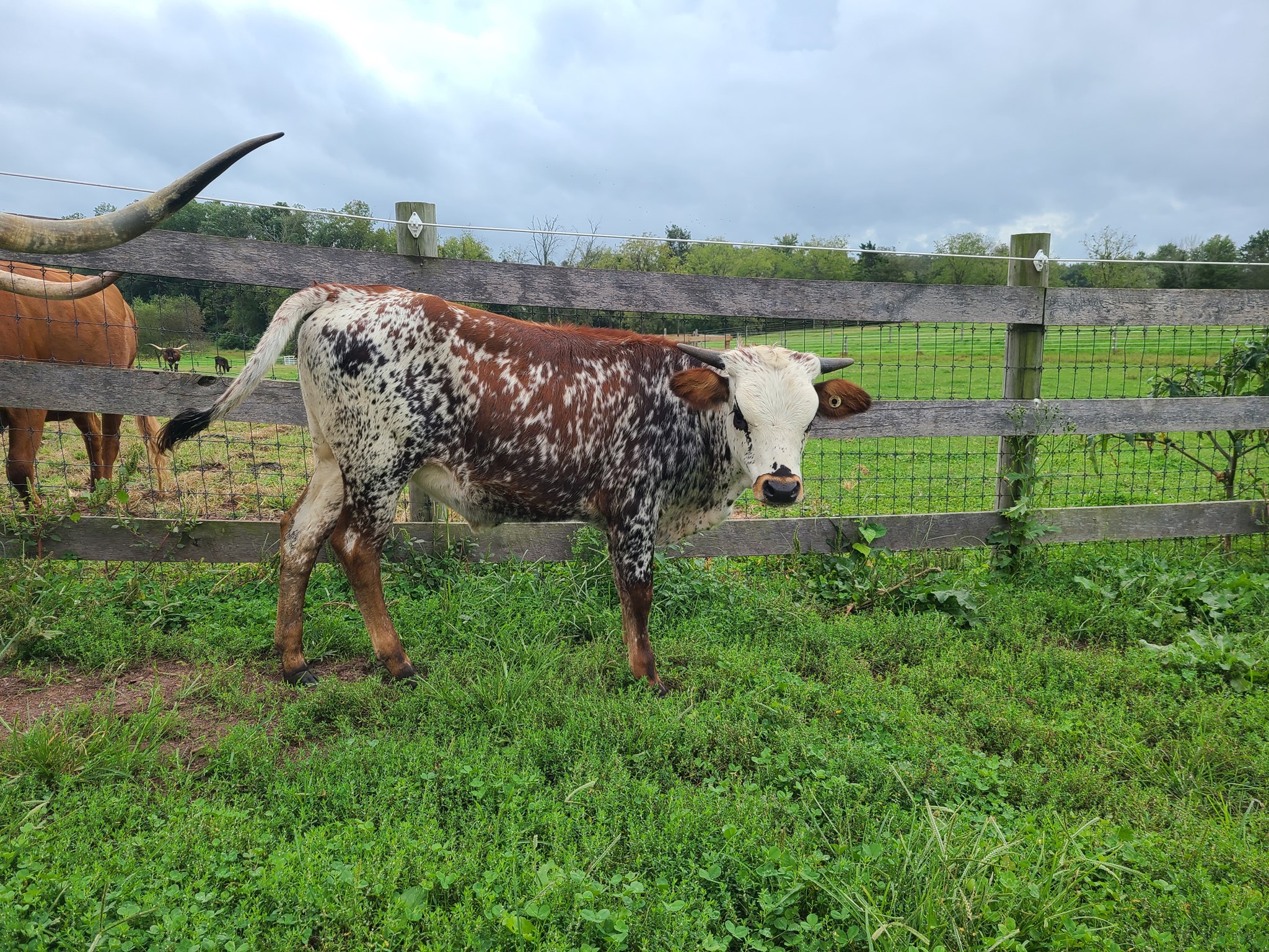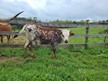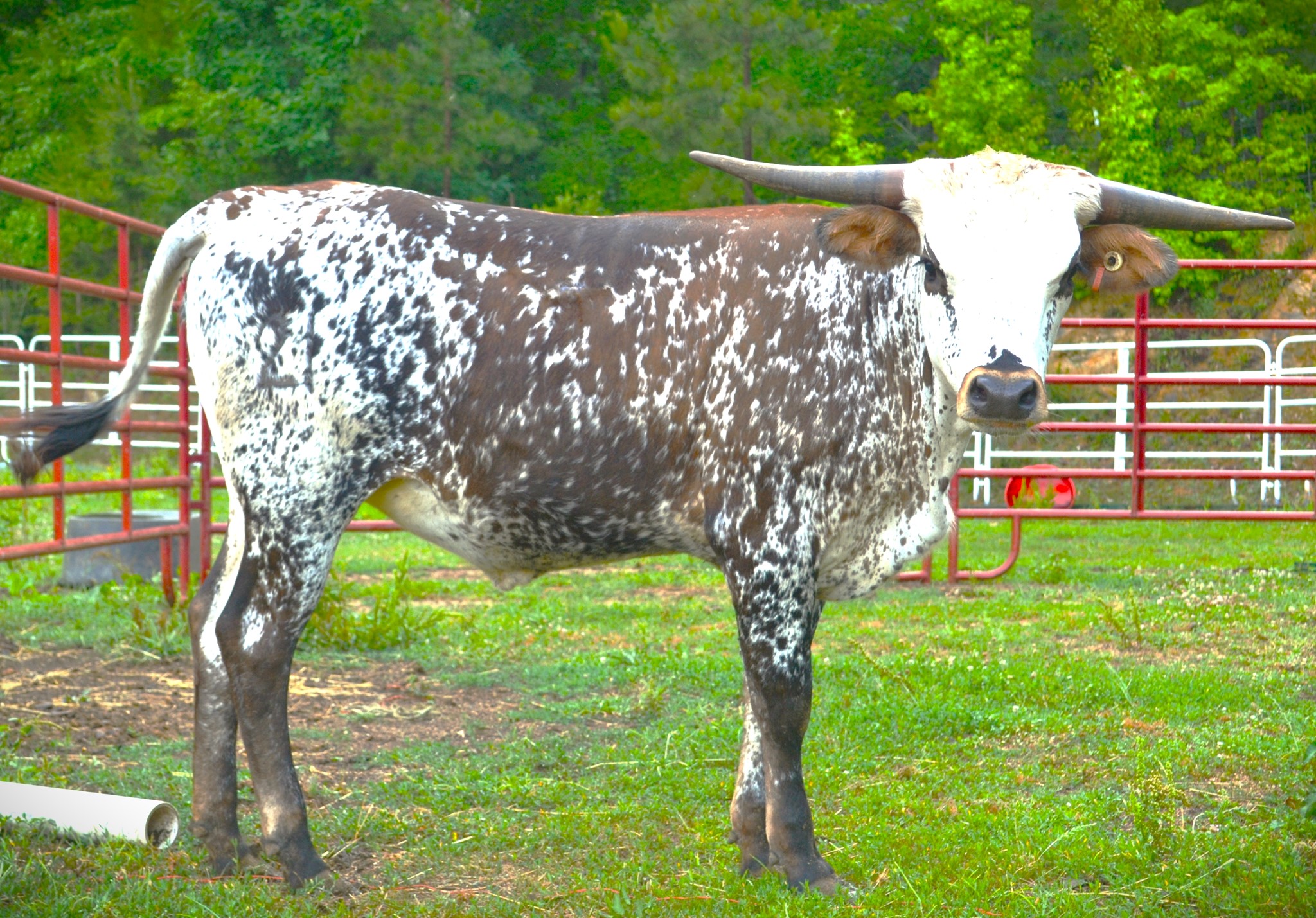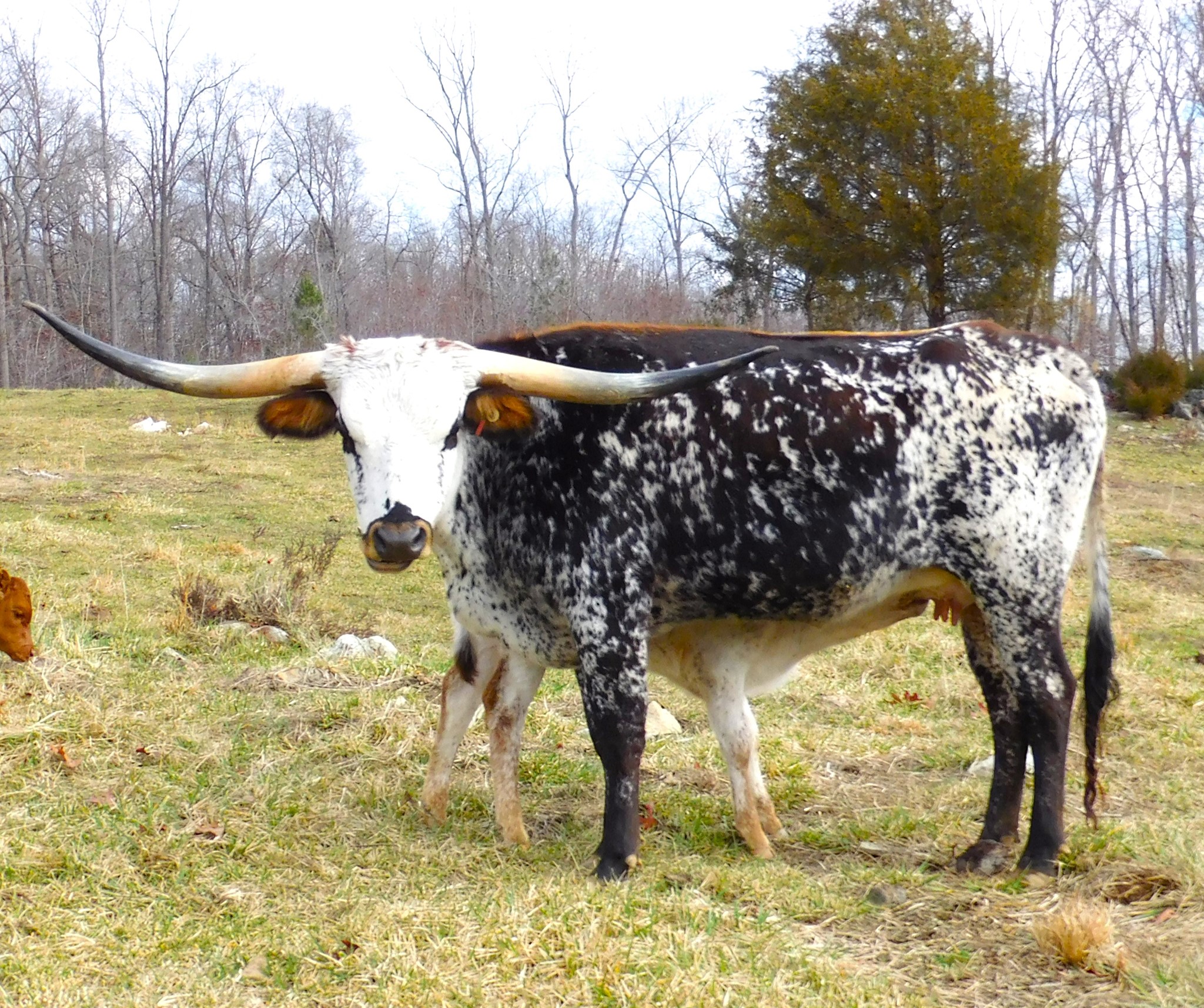 This young cow is the prettiest colored longhorn we have ever had in the pasture. She is a daughter of Dunn Got Double Lucky (97" TTT) and granddaughter of 105" Dunn Lucky Dice and Delta Lucky Ace. She raised her first calf out of KDK Wildfire and was a great Momma with perfect udders. She is confirmed bred again to KDK Wildfire for the Cherry Blossom sale in April 24' DNA on file and sire verified. Johnes and BVD negative. Bid with confidence on this stellar female to add to your herd.