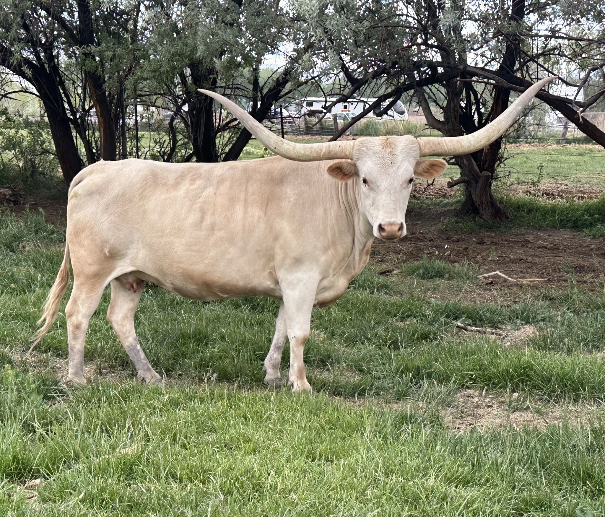 Beautiful Gold Mine daughter. She brings in Fifty Fifty and has huge horn genetics. She has a very fantastic heifer that we are retaining.
