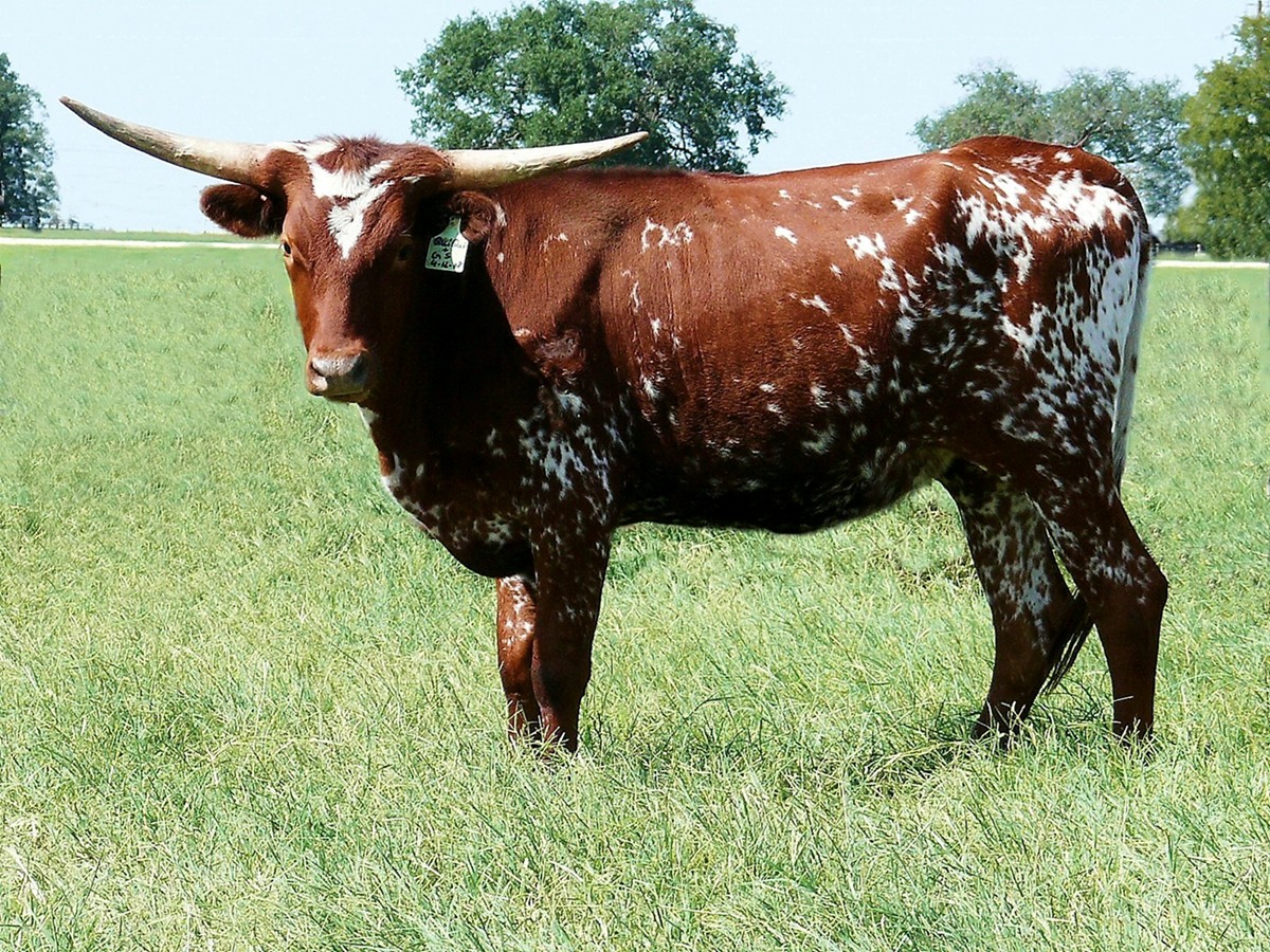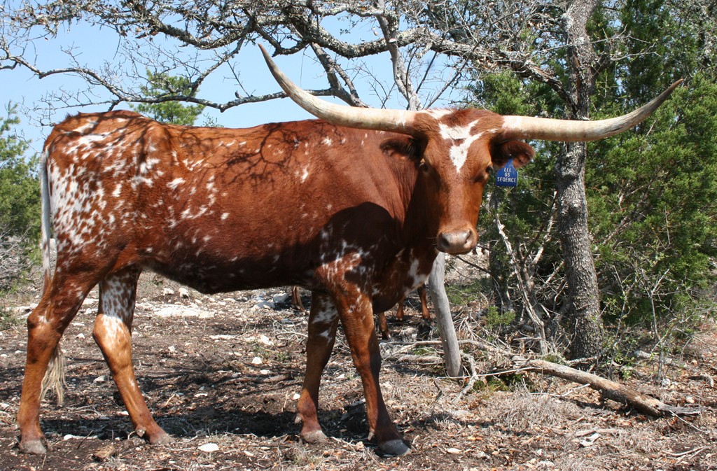 Sequence is a ruby red cow with white specs and higher set horns with a lot of total horn. She is out of the well known Gun Smoke bull and is the dam to our RZ Josey Wales (91" TtT). She is 75" TtT....